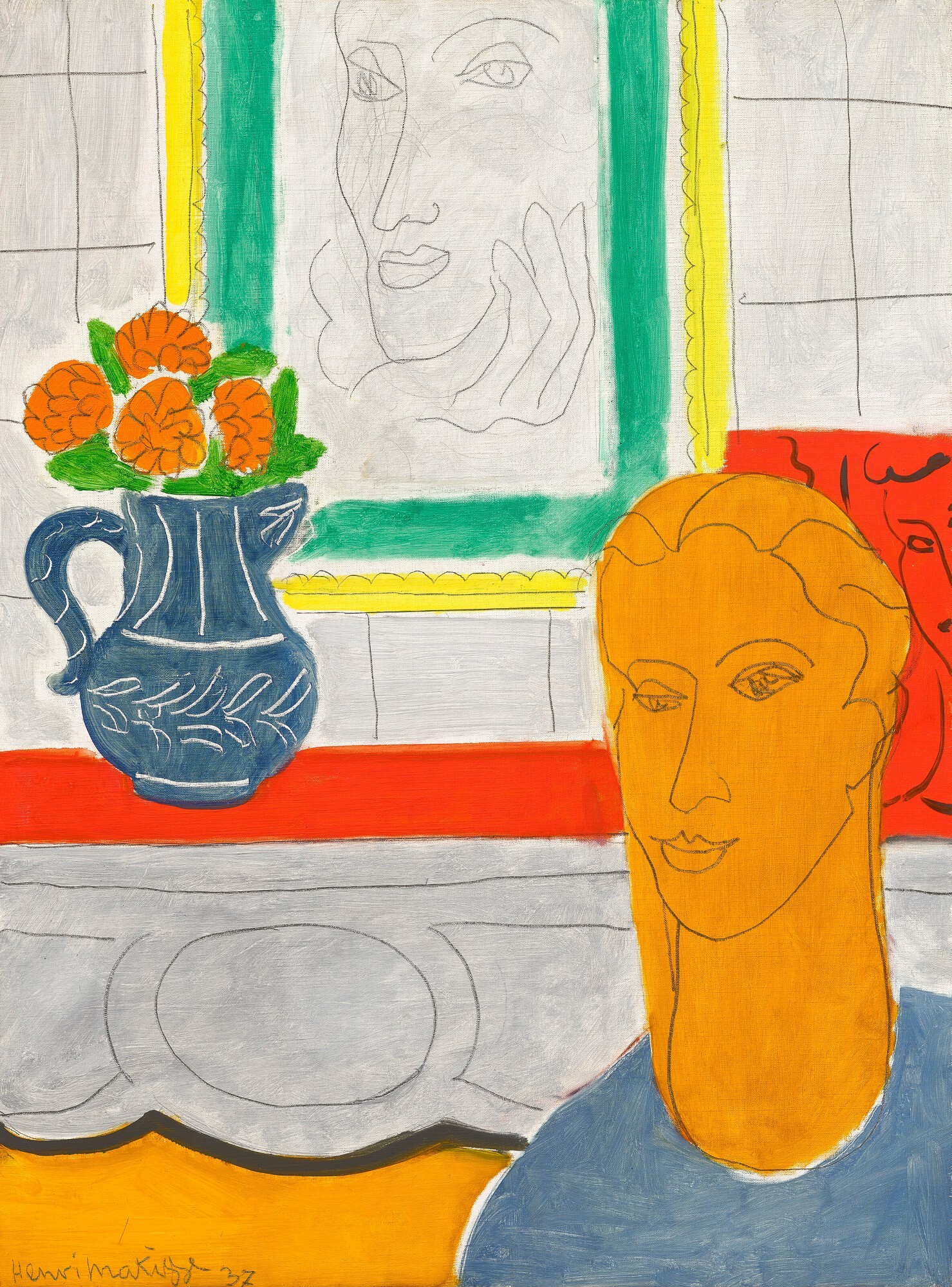 画作的构图也极具巧思,赭色人物与壁炉架上蓝色花瓶之间的对角线,为画面引入了纵深感与立体感,同时也使得前景中色彩鲜艳的人物与背景画框中的女子之间形成了一种有趣的镜像效果,引导观者关注她们面容的相似与差异之处——实际上,画中人物原型均为马蒂斯的模特兼助手 Lydia Delectorskaya。