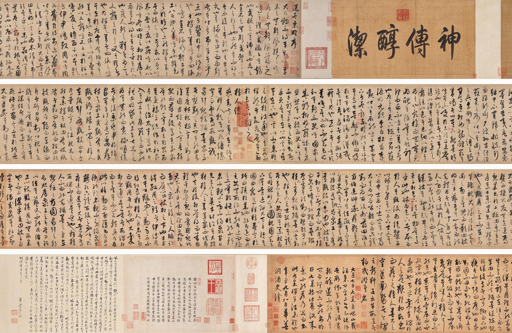 饶介是元末明初的重要书法家,草书以「二王」为宗,兼取张旭和怀素,飘逸奔放,秀媚多姿。此卷为饶介草书韩愈《送孟东野序》和柳宗元《梓人传》各一篇,尺幅是其传世书法作品中最长。全卷一气呵成,笔法变化多样、流畅自如,充分展现了饶介在书法艺术上的卓越造诣。卷前引首为乾隆皇帝亲笔御题的四字楷书「神传醇洁」。