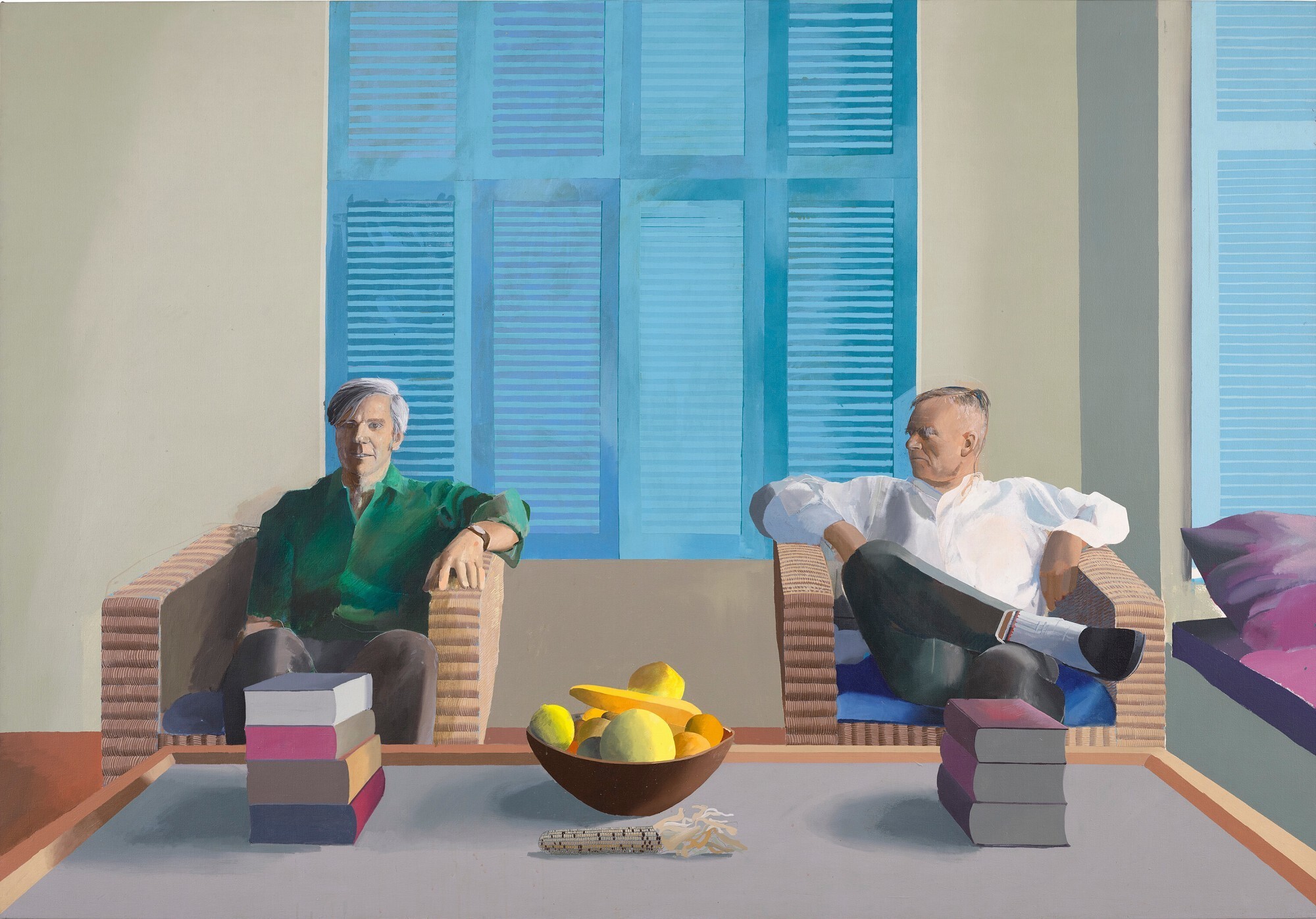 这是英国画家 David Hockney 标志性「双人肖像」系列的7幅画作之一,也是该系列的开题之作。作品描绘了英国作家 Christopher Isherwood 与其同性伴侣、美国艺术家 Don Bachardy 在加州家中的情景。画面中右侧的 Isherwood 转头望向他的恋人,而 Bachardy 则自信地凝视着观者——在1960年代美国社会尚显保守的背景下,这幅毫不掩饰同性恋情的双人肖像无疑具有深刻的变革意义。