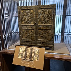 药柜通体黑漆描金,外部以龙纹装饰为主,柜门内侧则描绘花卉图案,柜背面有泥金填刻楷书「大明万历年造」六字款。该柜可盛放药品达140种,屉面上有涂金名签,标明每种药物的名称。