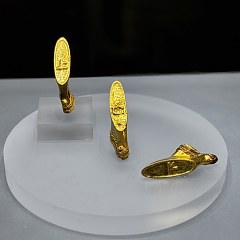 展览集中呈现两个遗址近十年考古新发现与研究成果。其中孔子漆衣镜镜匣(仿制品)背面的孔子及弟子肖像,还原了目前所知最早且唯一的早期孔子肖像;马蹄金器经矫形、拼接与补配后,恢复其原有形制与纹饰,再现汉代黄金工艺辉煌。