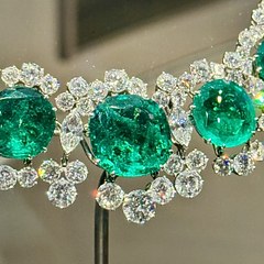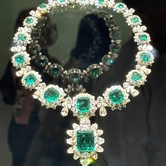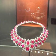 重要展品包括以「灵蛇」为主题的 Serpenti 项链、Serpenti 晚宴包,一组交替组合祖母绿、紫水晶、绿松石和钻石的项链和耳环套装,一件镶嵌7颗总重118.46ct的枕形切割哥伦比亚祖母绿的项链,以及垂坠一颗127.35ct心形雕花祖母绿的长项链等。