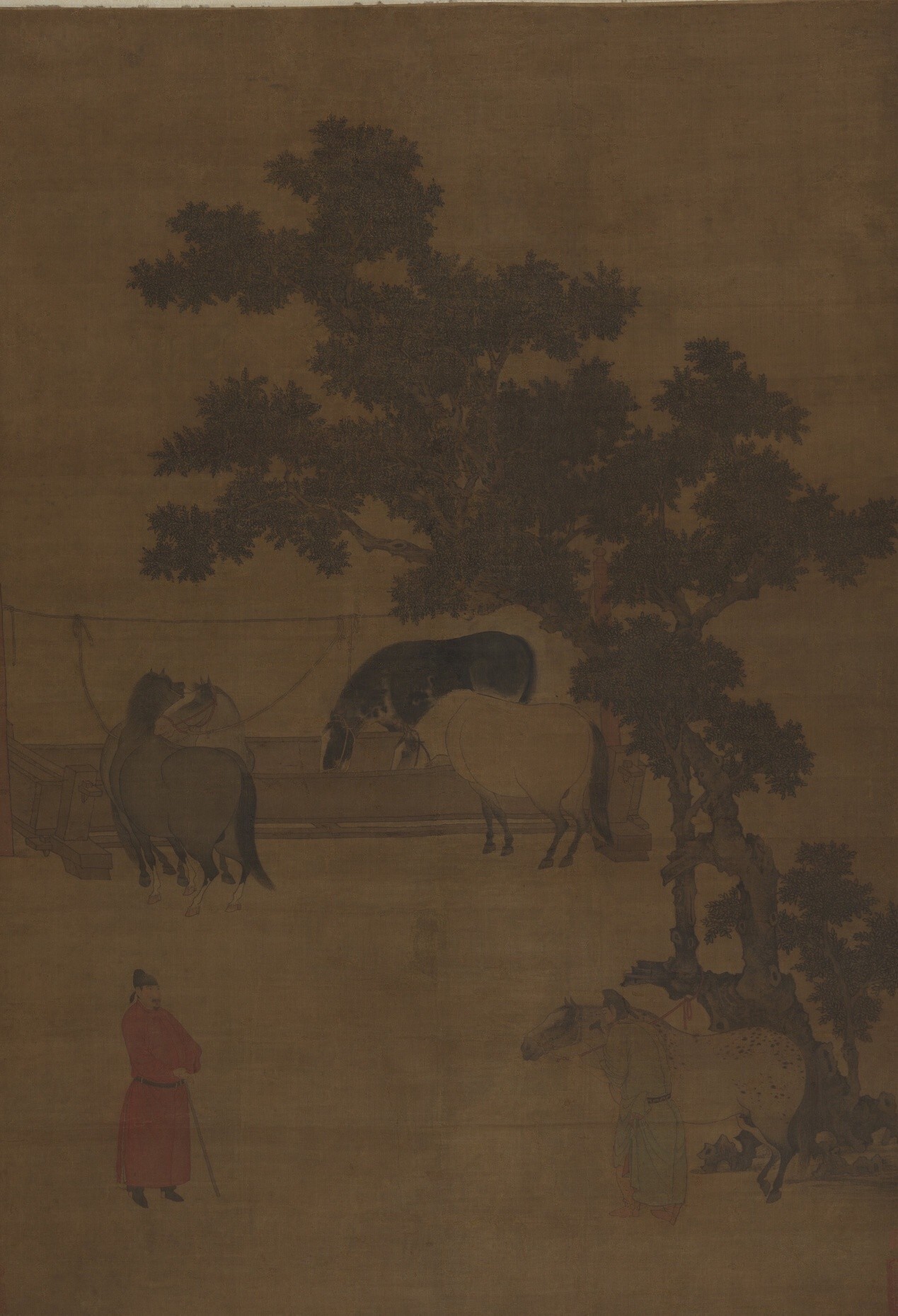 第二章「松风逸骏」汇集古代至现当代的马主题画作,这些作品中的马多为辽阔天地间的静默孤影,是艺术家高洁情怀的写照。最值得注目的是一幅元代《饲马图》,线条挺劲,马体健硕,笔墨高古,意境悠远。