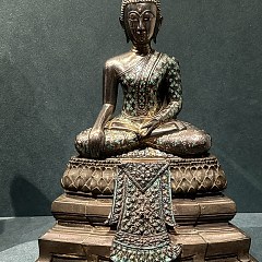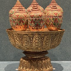 第三单元「良工巧治」展示泰国王室艺术,以器物功能分作礼仪及实用器、饰物、戏剧服饰,辅以清宫上述几类相应文物,呈现中泰两国宫廷在礼制规范、艺术审美及日常生活等维度的文化特征。第四单元「艺脉绵长」呈现泰国古代技艺在当代的传承与发展。