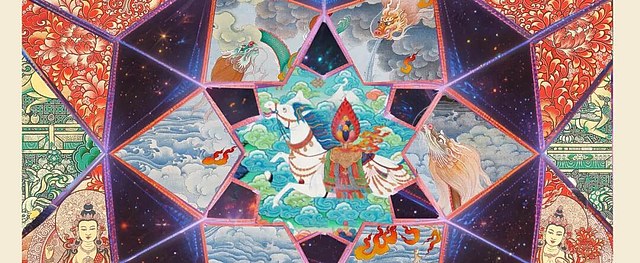 第二部分集中展示《中国藏族文化艺术彩绘大观》下部中的彩绘、堆绣与书法唐卡。彩绘唐卡采用黄金、红珊瑚、绿松石等珍贵矿物颜料绘制,色彩绚丽;堆绣唐卡以绸缎、彩线、羊毛为材,经剪贴、拼缀、平敷、缝绣等工艺构制画面,兼具绘画的构图意境与刺绣的肌理质感;藏文书法唐卡则展现出唐卡的丰富内涵和多元表达。