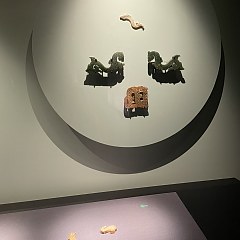 展览除了呈现楚国文化,还有部分展品反映了楚国与周边国家的关系,如出土于楚墓越王勾践剑、吴王夫差矛,曾侯乙编钟中的一件「楚王鎛」,从楚墓出土、来自中山国的三人踏豕玉佩等。