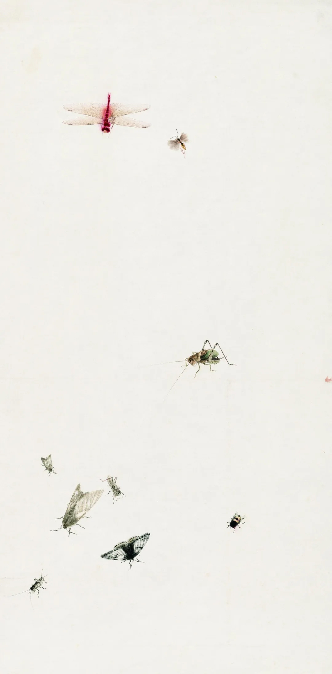 齐白石一生画过的草虫种类多达百种,包括蜻蜓、蚂蚱、蛾、蝉、螳螂、蝈蝈、瓢虫、天牛等。这些草虫或精致入微,或写意传神,无论工或写,皆形神兼备,栩栩如生,体现出画家对自然的悉心观察。