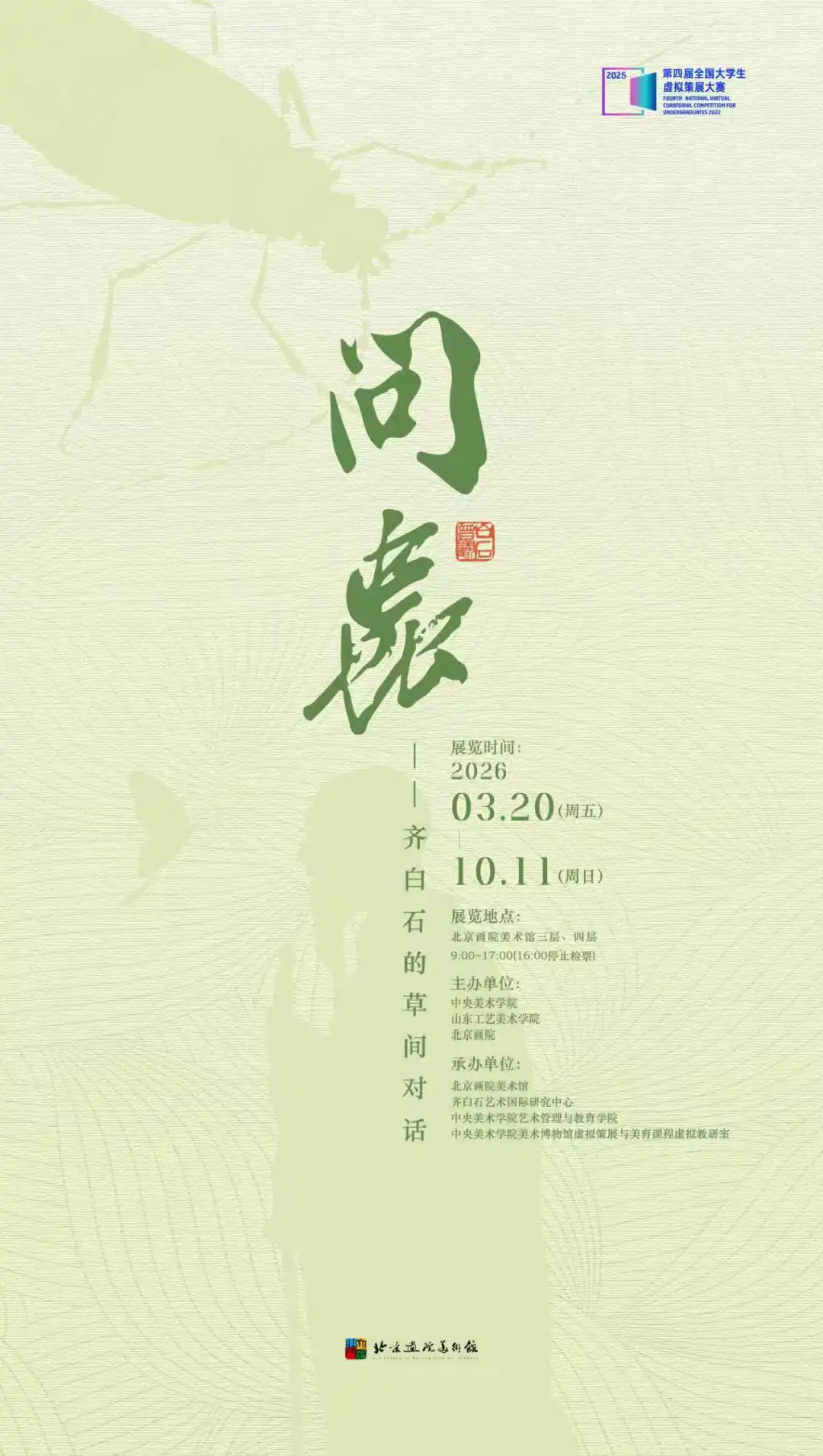 本次展览作为第四届全球大学生虚拟策展大赛(齐白石赛道)的特等奖获奖方案,尝试以自然科学的视角切入对齐白石艺术的观看。展览第一次全品类展出齐白石的草虫题材绘画,并置呈现昆虫标本与图鉴,探究齐白石作品中的自然观察与人文情怀。