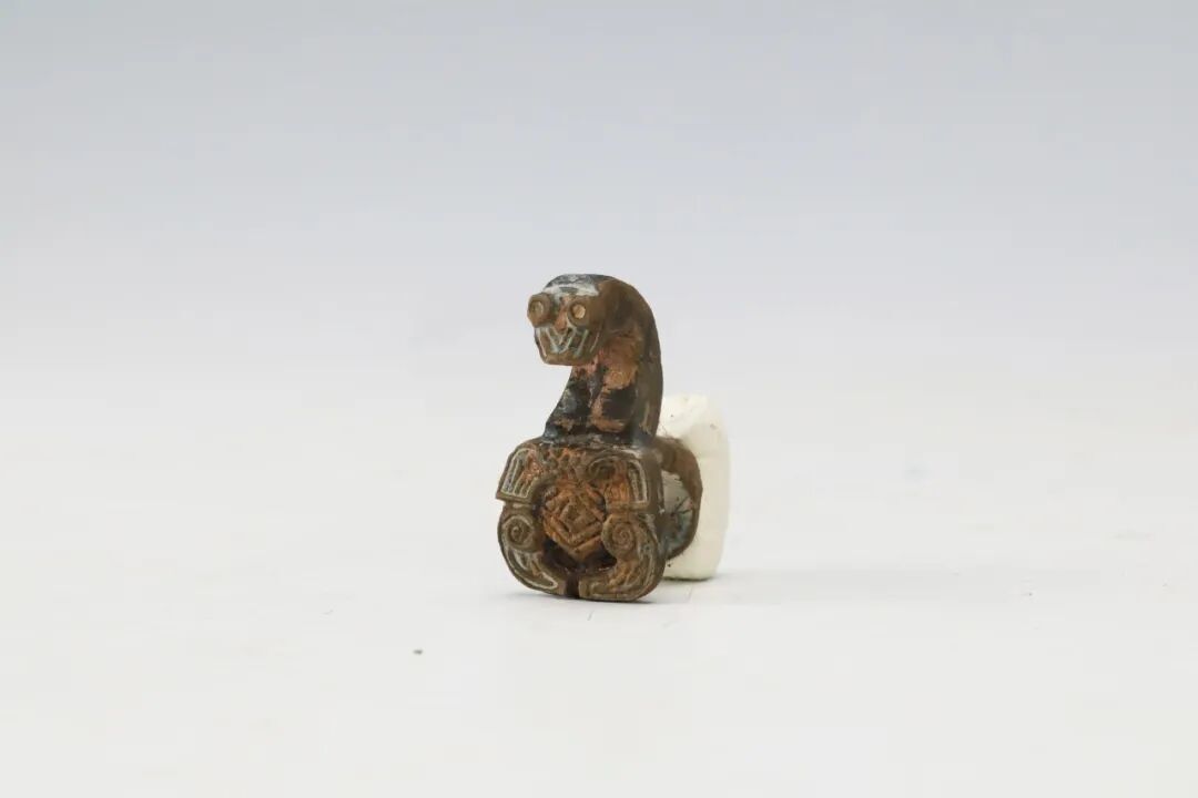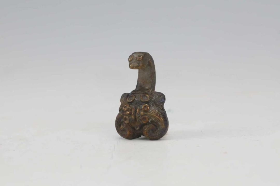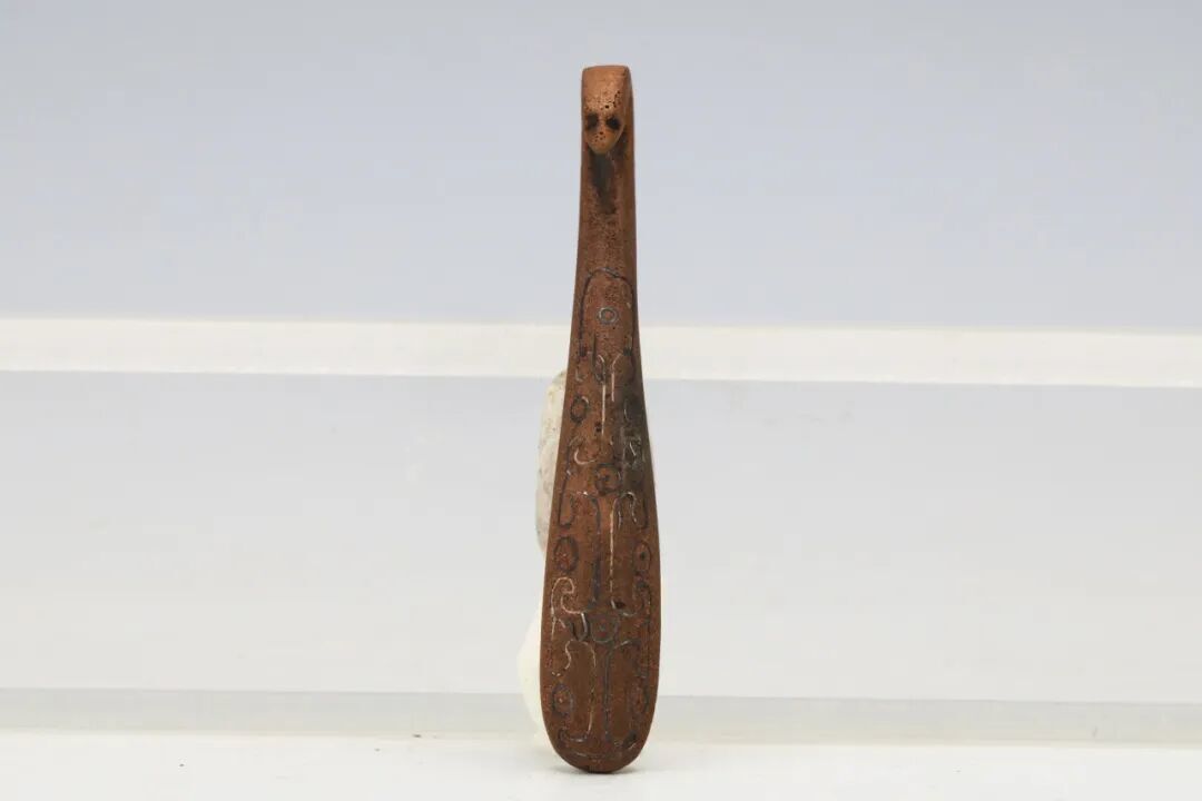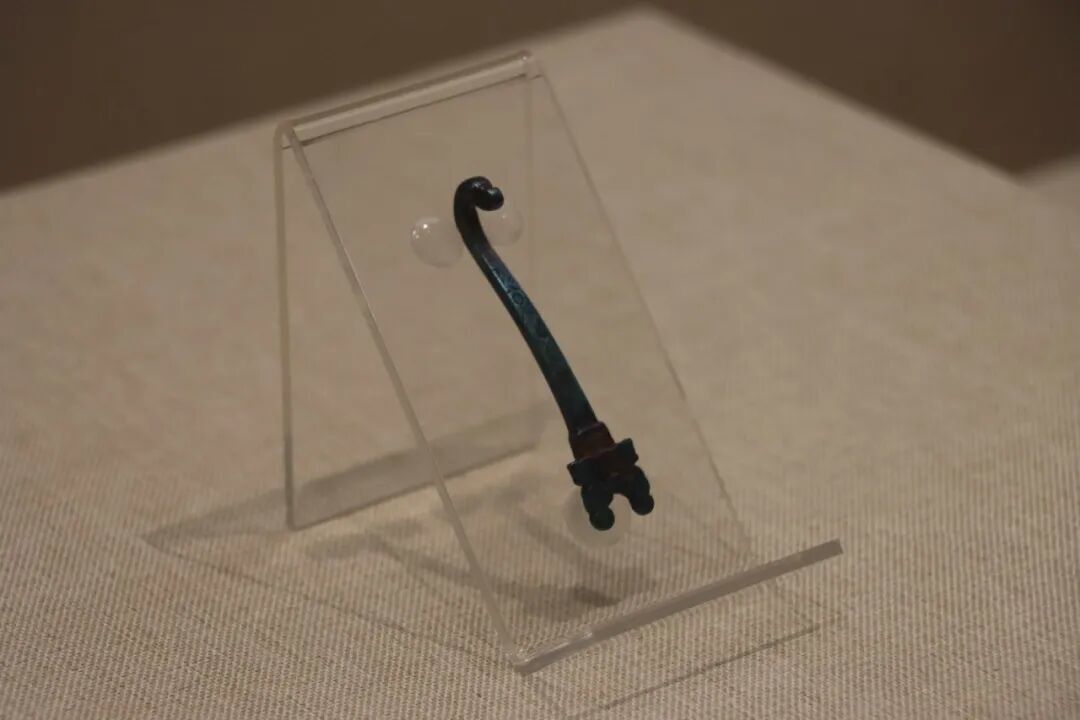 本次展出的带钩造型千姿百态:琵琶形、曲棒形、耜形各具特色,全兽形、兽面形纹饰生动,蟠虺纹体现了古越人的蛇图腾崇拜,水禽形、象首形更是融合了越地「象耕鸟耘」的生活特色。