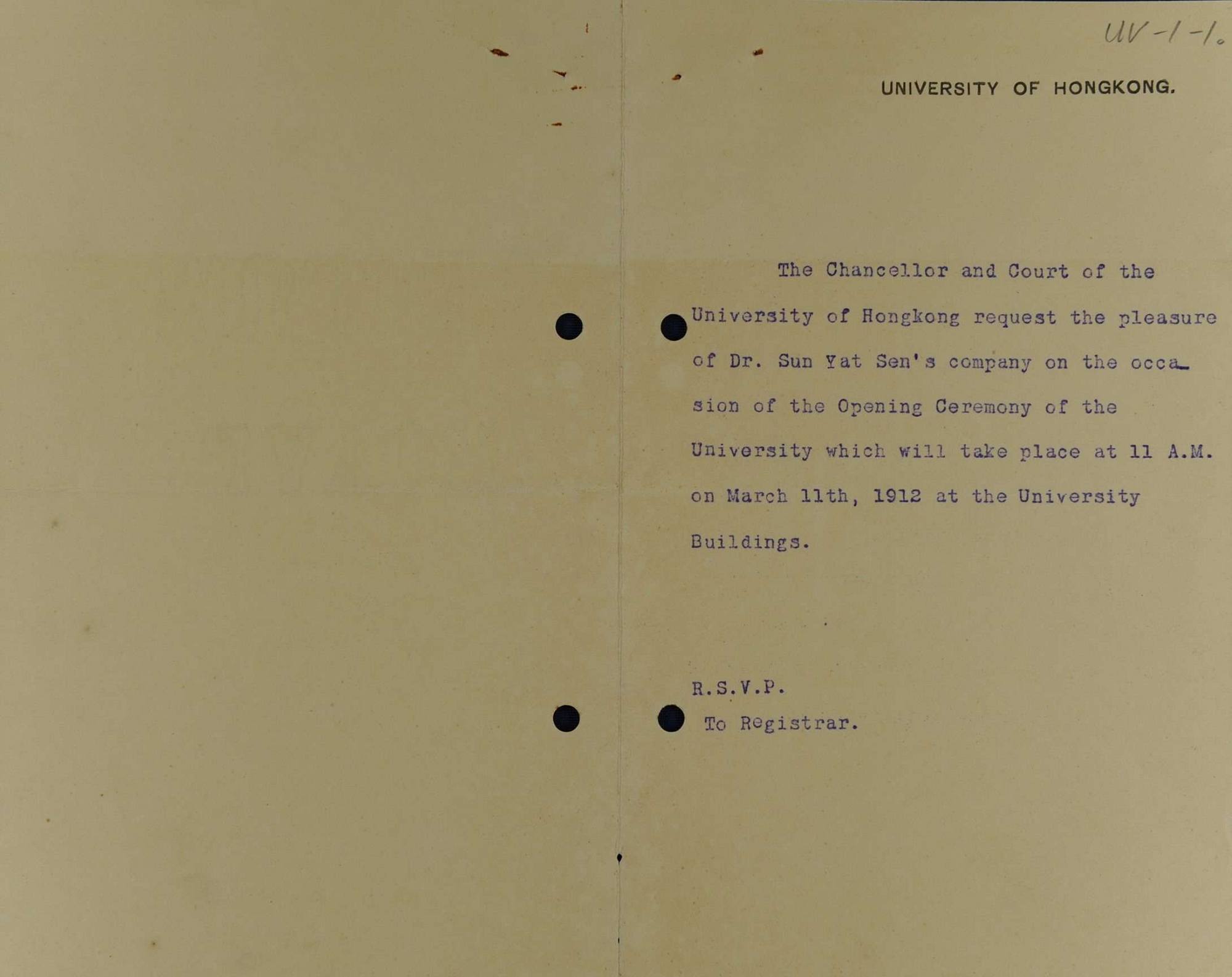 香港大学邀请孙中山参加开学典礼的信函,1912年,孙中山故居纪念馆藏