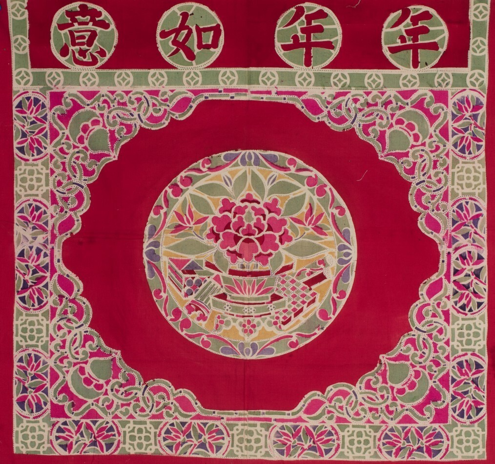 年年如意纹彩印桌围,产地:河南安阳,清华大学艺术博物馆藏