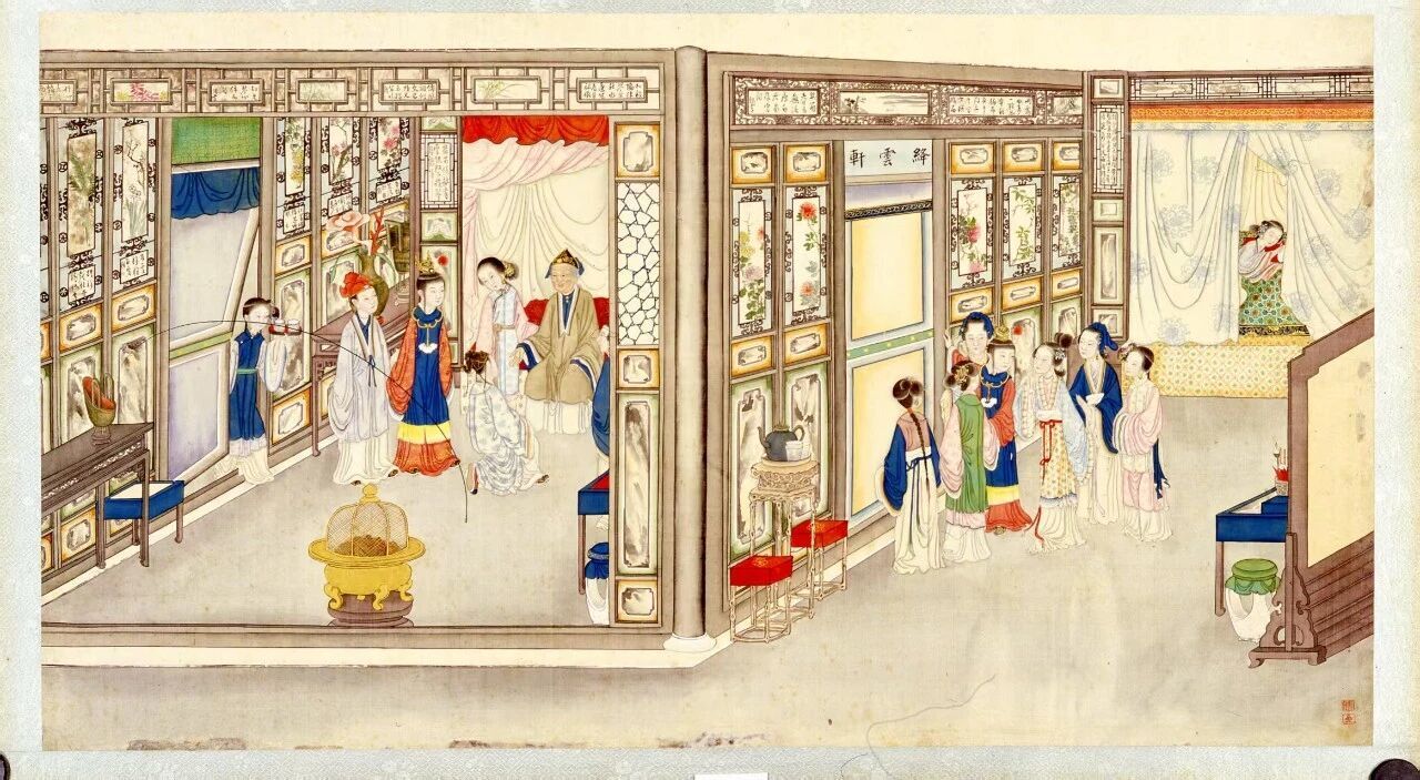 《红楼梦》画册之《晴雯笑贴绛云轩匾 宝玉领秦钟拜贾母》,孙温、孙允谟绘,旅顺博物馆藏