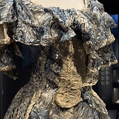 展览以18世纪华丽的宫廷礼服作为开场,展示法国王室成员和贵族如何利用礼服在宫廷内外展现其身份和地位。至19世纪中期,形如鸟笼的大型硬质裙撑成为法国以至全欧洲极具标志性的时尚特色,这类鸟笼状的裙撑塑造了当时贵族女性的细腰和沙漏体形,象征华丽服装为人们带来的愉悦和痛苦。