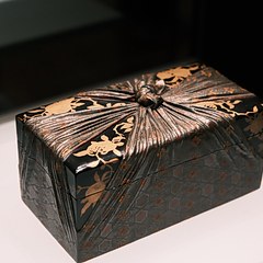 黑漆嵌螺钿缠枝花卉纹银锭形盒,元代,旧金山亚洲艺术博物馆藏