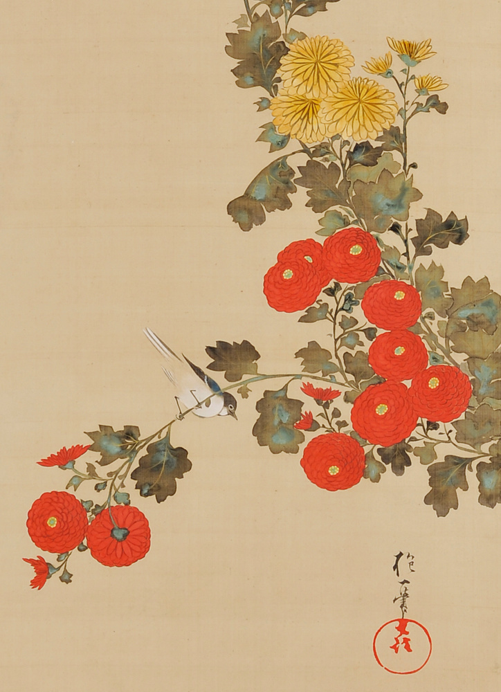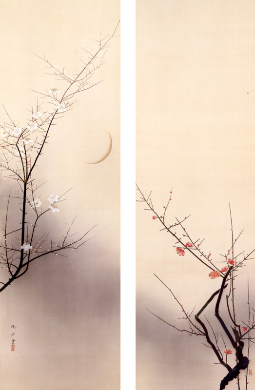 展览以近现代的日本画为中心,将日本近代画坛名家创作的四季花卉汇聚一堂。例如横山大观《春朝》描绘山间樱花在晨曦中绽放的景象;山口蓬春《梅雨晴》呈现雨后绣球花在阳光下盛开的情景;酒井抱一《菊小禽图》生动展现了秋日的菊花与可爱的小鸟;速水御舟《红梅·白梅》诗意演绎冬季月色下梅花绽放的场景。