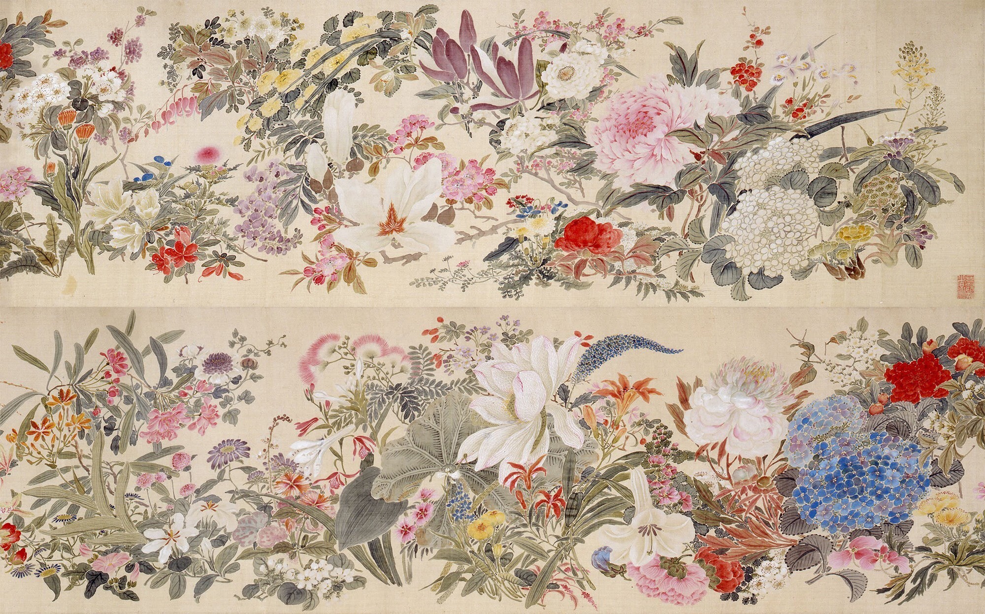 最引人注目的一幅作品当属田能村直入的《百花》,画家在长近40米的画卷上以写实细腻的笔触描绘了100种花卉,营造出一个超越季节的、百花缭乱的绚丽世界。