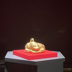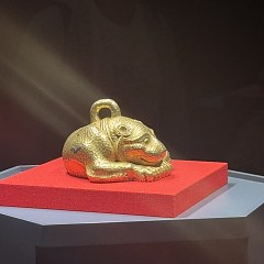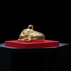 这件金兽长17.5厘米、宽16厘米、高10.2厘米,含金量高达99%,重9100克,是目前我国出土古代黄金铸器中最重的一件。金兽呈豹形,屈腰团身,神态警觉,通体锤饰圆形斑纹,腹内部刻有「黄六」二字。研究人员推测金兽寓有镇邦护国、辟邪压胜之义,寄托着天下太平、国富民强的美好祈愿。