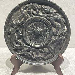鱼纹是金代铜镜最具代表性的主流纹饰,本次展出的双鱼纹铜镜绝大多数出土于黑龙江省境内,勾勒出金代核心统治区域的文化风貌。金代龙纹镜继承了唐代龙纹镜的雄浑基调,造型粗犷奔放、雄浑豪迈,线条遒劲有力,具有鲜明的时代特征。