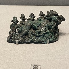 这件扣饰造型生动有趣,动感极强。从两个舞蹈者的形象特征与装束看,应是异域来客,有学者认为他们是北方草原游牧民族「塞人」。此铜扣饰对于研究汉代的盘舞有很高的参考价值。