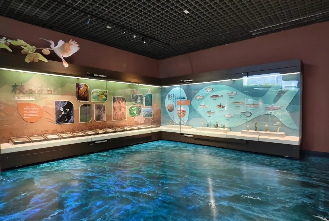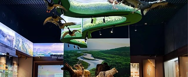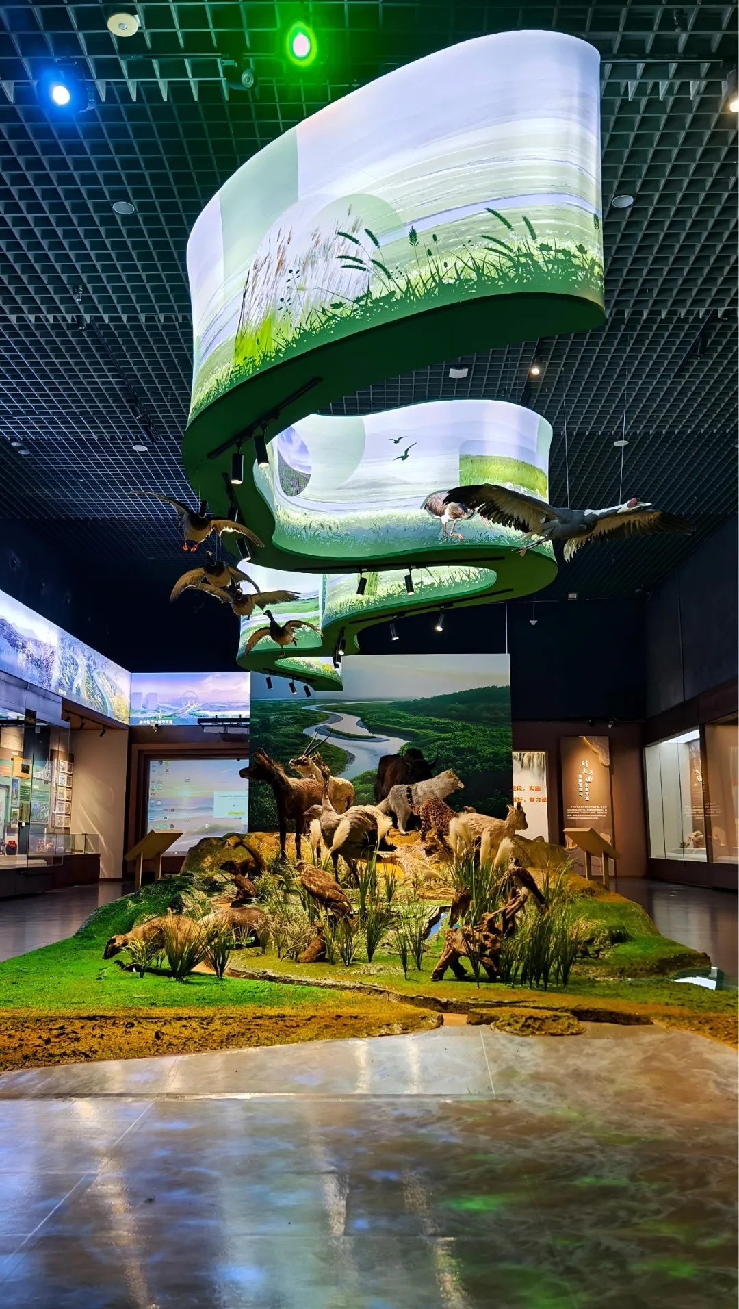 第二单元「万物和鸣:自然生态与多样生灵」聚焦流域生物多样性,通过大型生态景观装置,立体呈现黄河流经三大阶梯的地貌特征及典型动植物群落,陈列的动物标本包括华北豹、藏羚羊、朱鹮等。