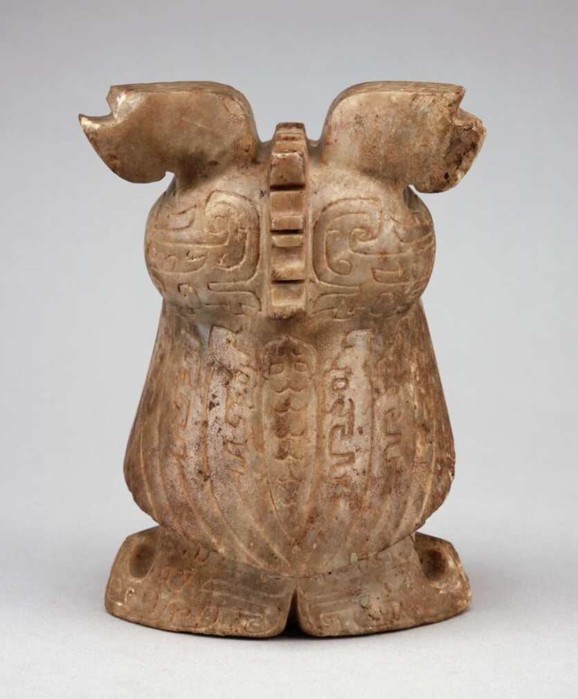 这件大理石枭形小立雕高17.1厘米,重2.5公斤,头呈扁圆形,两耳曲折,双圆眼,喙曲如钩,后背两翅聚合,双足为直立的圆柱体,通体施以繁复纹饰,造型生动,制作精美,是殷墟出土大理石雕刻的代表之一。