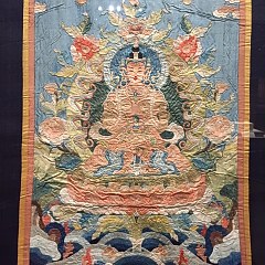 公元7世纪中叶佛教传入西藏,与本土的苯教及文化相融合,形成了藏传佛教。「唐卡」系藏文音译,指用彩缎装裱后悬挂供奉的卷轴画,是藏族文化中独具特色的绘画艺术形式。唐卡用料考究、色彩天然、绘制复杂、法度森严、装裱华美、题材广泛,可称为西藏宗教和世俗生活的「百科全书」。