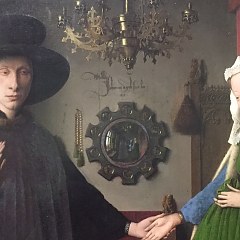 重点展品是《阿尔诺非尼肖像》,创作于1434年,描绘的是布鲁日商人 Arnolfini 和他的妻子肖像,一只棕色宠物犬立于妻子脚边。他们身后的镜子中映出两个人,其中一位被认为是范·艾克本人,Arnolfini 的右手抬起,似乎是在向范·艾克打招呼。镜子上方的拉丁文为范·艾克的签名和这幅油画的创作日期。