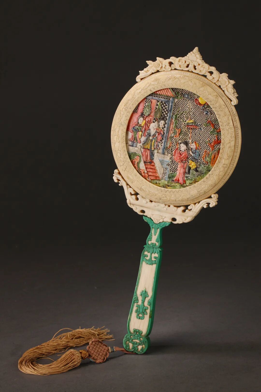 象牙雕人物彩绘带柄圆镜,清代,广州十三行博物馆藏