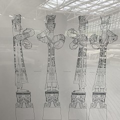 展览挑选良渚遗址、三星堆遗址、金沙遗址和四川其他时期重要文物的线描图进行展示,重要展品包括方向明绘「良渚玉琮上的神徽」、「豪华权杖」、罗泽云绘「三星堆铜立人像线描图」、「铜神坛」等。