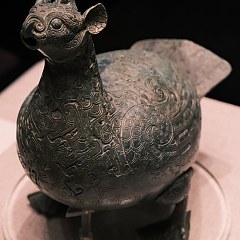 本展最重要的展品是战国时期「青铜虎钮錞于」,通高68厘米,是目前国内同类完整器中最大的一件。錞于上部的钮作虎形,盘面雕铸五组纹饰:独髻人头、站立船头的羽人击鼓、鱼与卷云纹、夔龙与柿蒂纹、花蒂(手心纹),反映了古代巴人的生活及信仰。