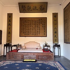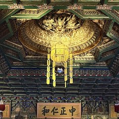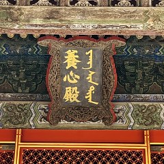 养心殿正殿明间依照雍正以来举行小朝会时的样貌布置,宝座上方悬挂雍正御笔「中正仁和」匾。西暖阁按照雍正乾隆时期布置,悬挂着「勤政亲贤」匾和「惟以一人治天下,岂为天下奉一人」的对联。