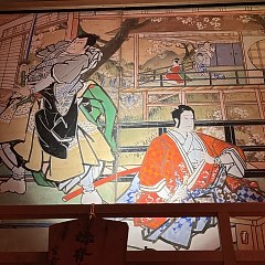 绘金最具代表性的作品是戏剧屏风画,这是一种在二折屏风上描绘歌舞伎或净瑠璃故事的画作,会用于戏剧表演与神社祭典。绘金以高饱和度的色彩表现混杂暴力、情色与鬼怪元素的戏剧性情节,展现出洋溢市井猥杂气息的鲜明画风。时至今日,高知夏日祭典期间,绘金的屏风画仍会陈设于神社或商店街的屋檐下,在摇曳不定的烛光中,营造出一种震撼人心的魄力。