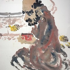 林墉擅长绘制人物画、花鸟画和山水画,作品风格潇洒,画面清新明丽。展品中的老人像以苍劲豪迈的笔触勾勒出文人墨客的古雅形象,落笔灵活恣肆,流露出风轻云淡的禅意。