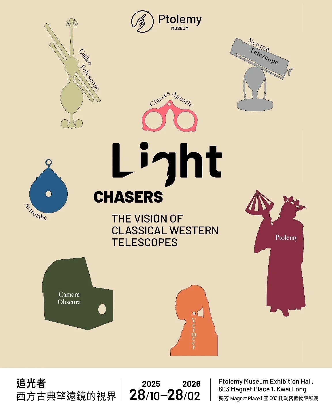 这是中国香港地区首次举办古典望远镜主题展览,以托勒密博物馆收藏的欧洲古董望远镜为核心,梳理从古希腊时代到近代科学革命期间人类借光学探索宇宙的壮阔历程。