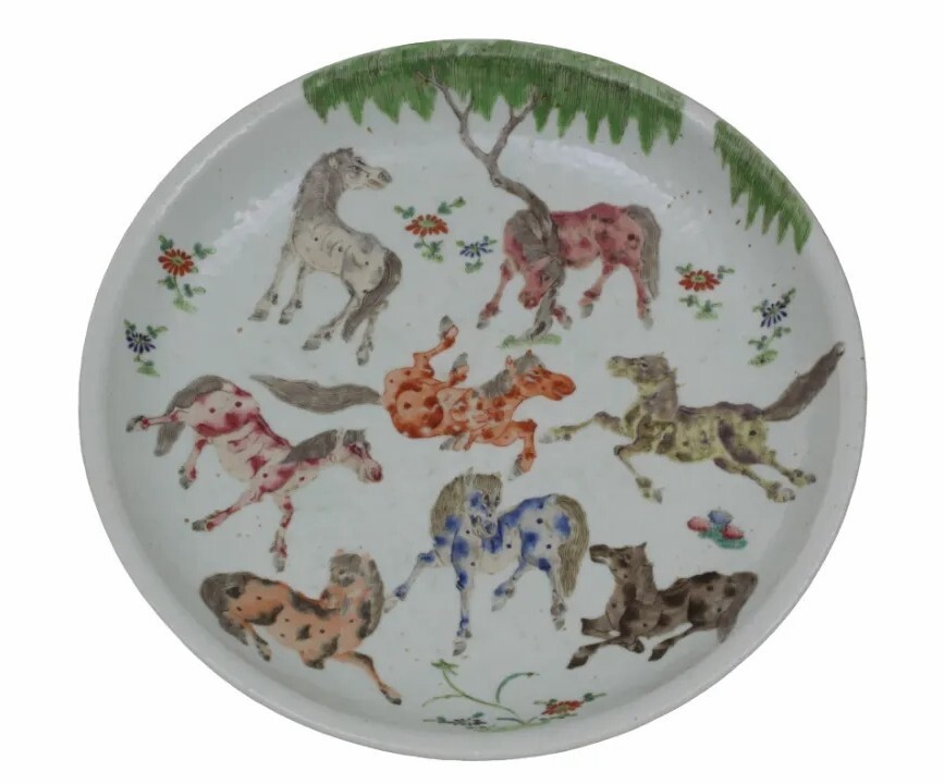 五彩奔马纹大盘,清代