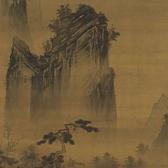 吴镇(1280-1354),与黄公望、王蒙、倪瓒并称「元四家」。本幅画山石用披麻长皴,沉着有力,苔点墨韵变化生动。飞瀑自巍峨陡峭山崖之间顺势而下,远山平湖空阔,近景双松挺立,空间层次丰富。
