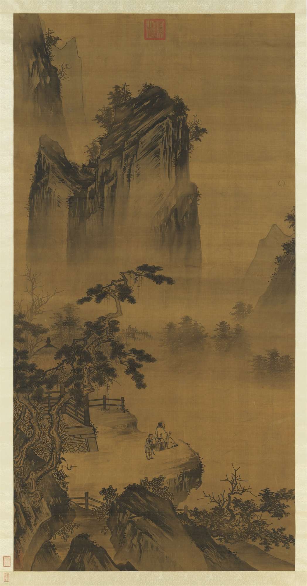 高耸的山峰矗立在画幅中央,山岭层层堆叠,山石的结构怪异,全作的构景离奇,恍如梦境一般。从全作的构图、山石的造型和笔墨的特征看来,可能出自明末画家吴彬之手。