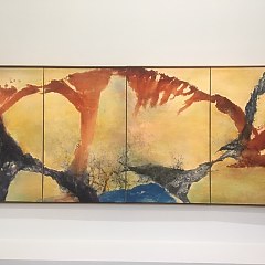 第三部分展出他在20世纪80年代至21世纪完成的作品,这一时期的赵无极关注色彩、空间布局与光影的变化,并在画作中融入更多中国水墨画元素,代表作包括1991年的布面油画三联画《向克劳德·莫奈致敬,91年2-6月》。最后一部分集中展示赵无极的大尺幅水墨作品,包括4套创作于2006年、此前从未公开展出的水墨作品。