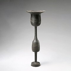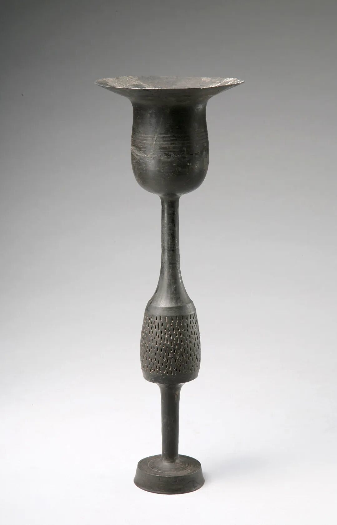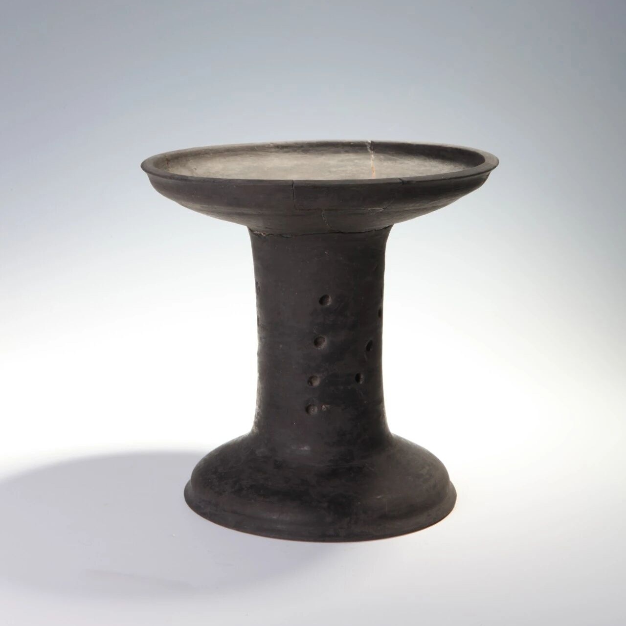 龙山文化蛋壳黑陶高柄杯1973年出土于日照东海峪遗址,器壁薄如蛋壳,杯身饰以细密的镂孔,柄内藏有陶丸。蛋壳陶表面乌黑发亮,有「黑如漆,明如镜,薄如纸,硬如瓷」的特点,是典型龙山文化的特征性器物,代表了中国远古时期制陶工艺的最高水平。