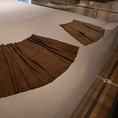 部分明代马面裙文物限时展出,包括山东博物馆藏蓝色缠枝四季花卉纹织金妆花缎马面裙、白色暗花纱绣花鸟纹马面裙及江西省博物馆藏黄褐色织缠枝莲花纹马面裙。