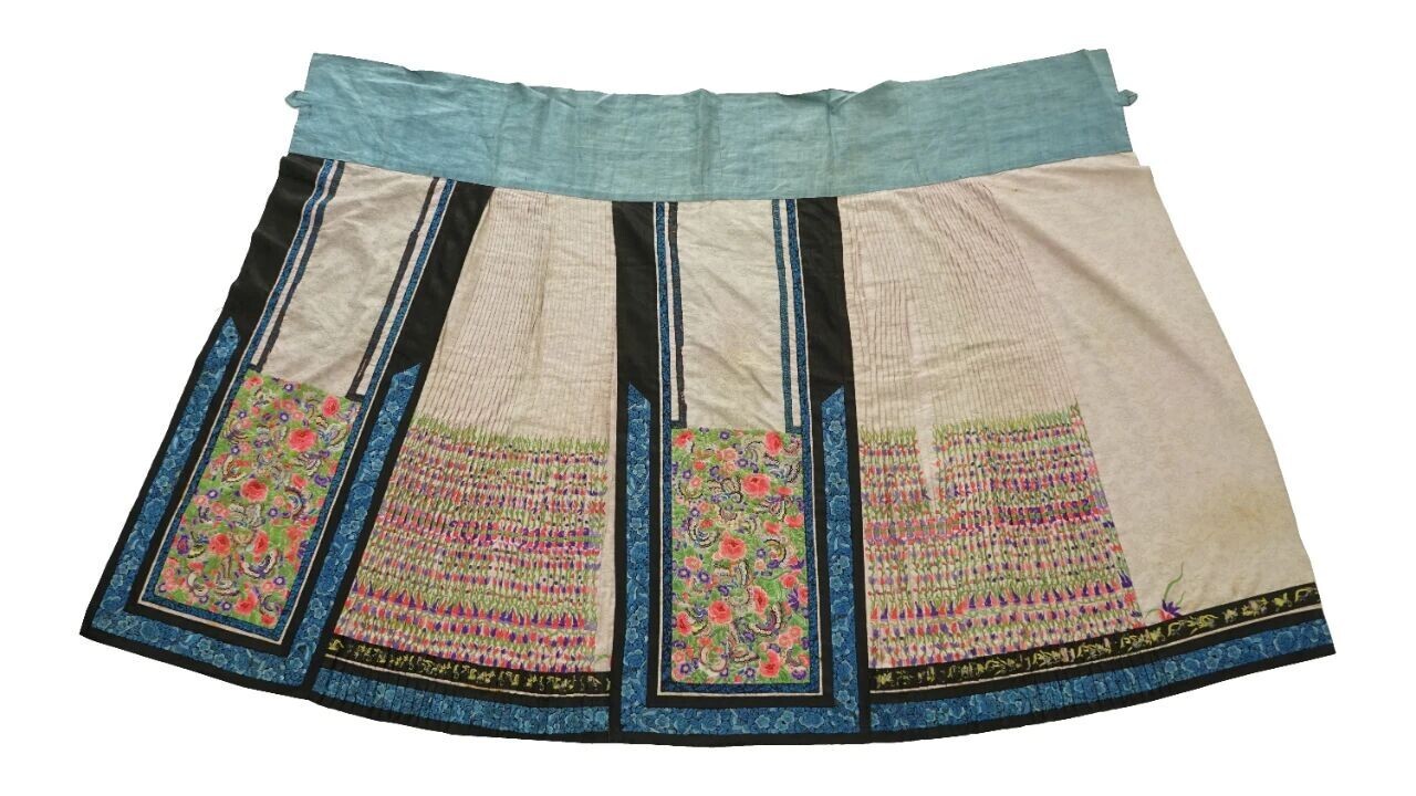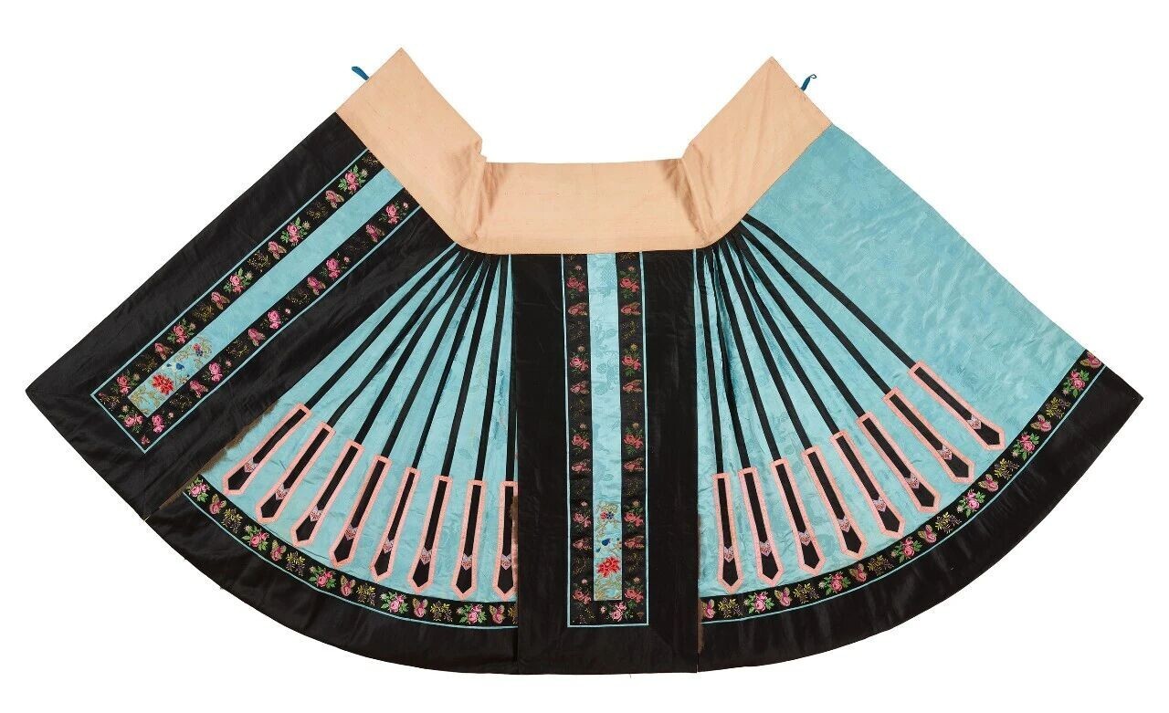蓝色暗花缎地绣花鸟纹夹棉阑干马面裙,清代,北京服装学院民族服饰博物馆藏