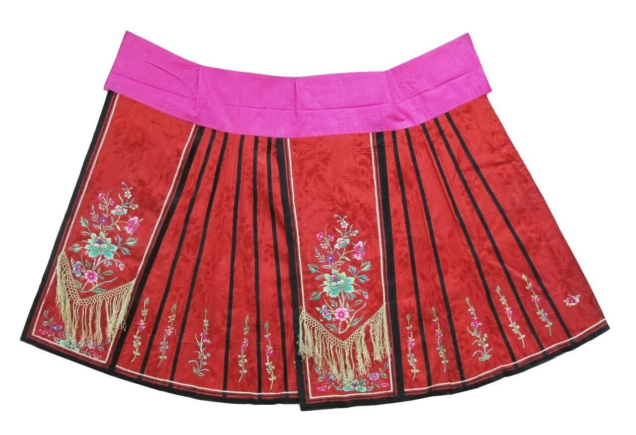 红色提花绸刺绣花卉纹阑干马面裙,20世纪初,北京服装学院民族服饰博物馆藏