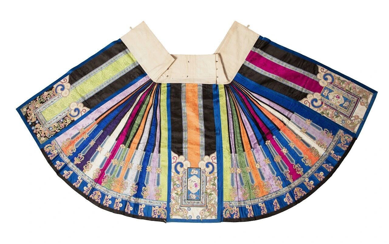 多色缎地绣庭院仕女缀花卉纹月华马面裙,清代,广州博物馆藏