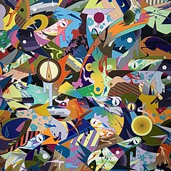 在松山智一的画作中,他将编辑过的图片剪切拼凑,以多彩的画面呈现多样而矛盾的现代文化。在他的抽象系列中,他以千纸鹤作为主体,将这一象征性的图标运用到他的绘画里。