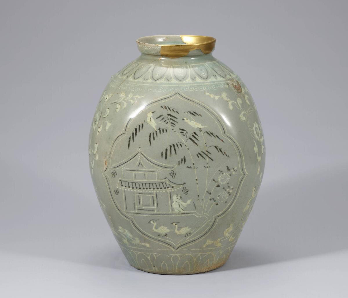青瓷镶嵌山水人物纹扁壶,高丽时代(13-14世纪),韩国国立中央博物馆藏
