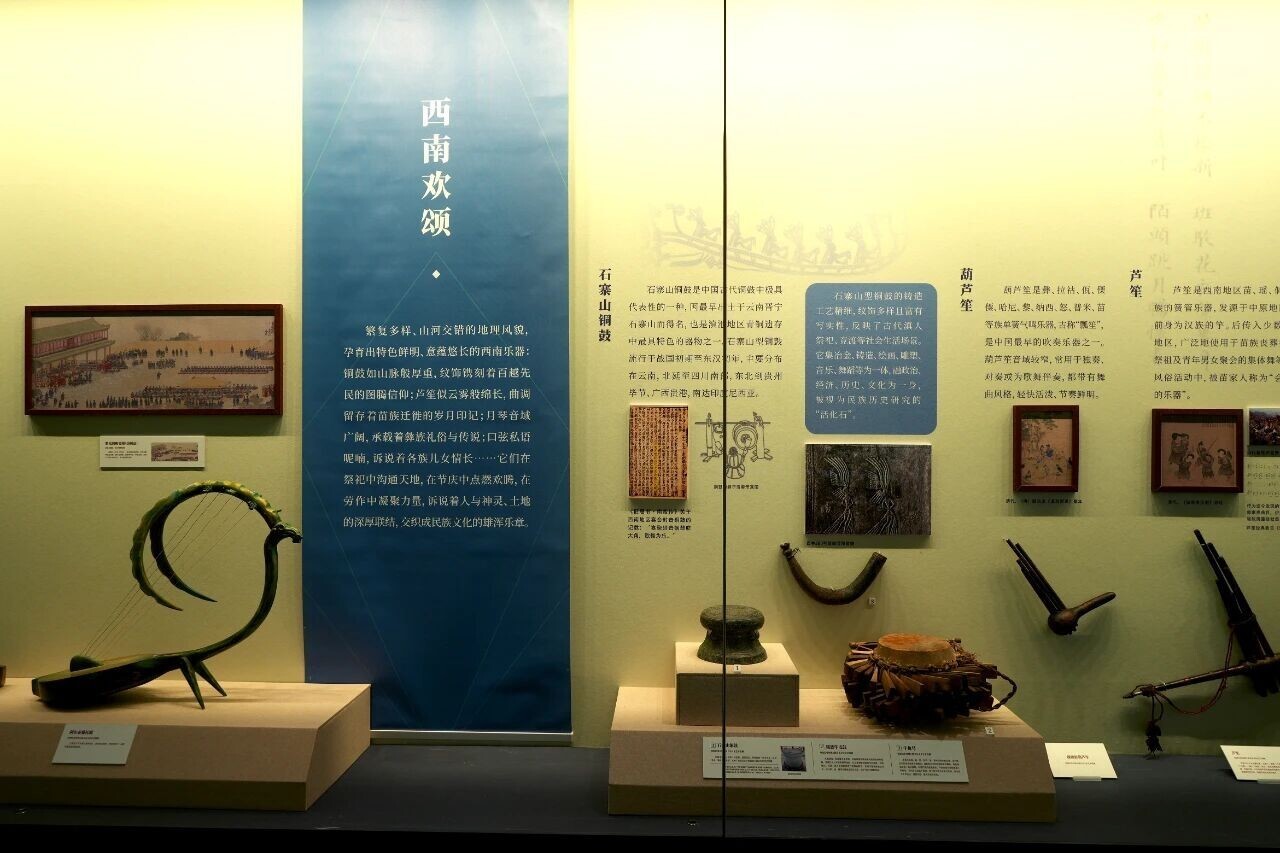 「东方音韵」单元系统梳理东方音乐的文化脉络,通过古琴、阮咸、笙等文物展现中国传统音乐体系的完备性;「四域千籁」单元则聚焦中国境内的音乐多样性,通过蒙古族的马头琴与潮尔、西南各族的铜鼓与芦笙、岭南的高胡与独弦琴等特色乐器,展现中华音乐「和而不同」的多元一体格局。