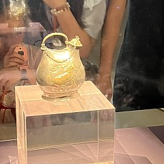 重点展品包括禁止出境展览的海内孤品——镶金兽首玛瑙杯,以及鎏金鹦鹉纹提梁银罐、鎏金舞马衔杯纹皮囊银壶、鸳鸯莲瓣纹金碗、和同开珎银币、狩猎纹高足银杯、葡萄花鸟纹银香囊、金花银盖碗等。