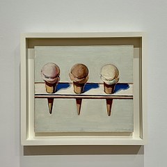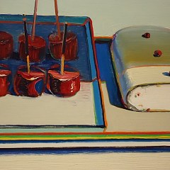 Wayne Thiebaud(1920-2021),美国波普艺术家,以描绘战后时期日常生活中各种物品的静物画闻名。他继承夏尔丹、马奈、塞尚等人的艺术理念,把日常物品视作当代艺术取材的重要来源,以丰富而充满活力的色彩和笔触,将冰淇淋、蛋糕、食物柜、糖果扭蛋机、弹珠台绘于画布之上。
