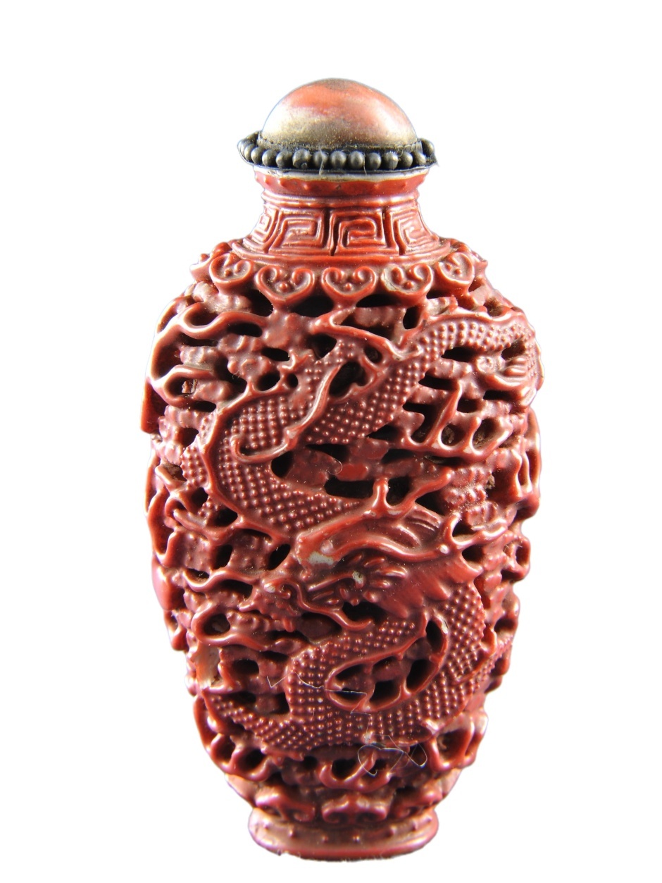 红釉镂雕龙凤呈祥图鼻烟壶,清代