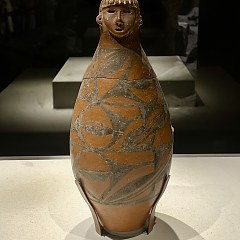 属庙底沟类型早期,距今约5500年,瓶高31.8厘米,器形为两头尖的长圆柱体,瓶口呈圆雕的女性人头像。